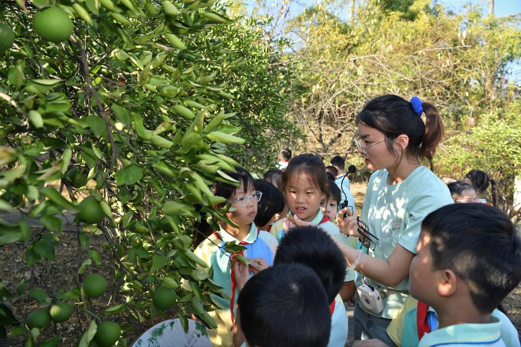 罗思宇向同学们介绍了“食品从哪里来”,通过讲述豆腐、馒头、爆米花等加工过程,带领小朋友认识豆类、小麦等作物并了解基础的农具。李炎静以“农作物的一生”为题,由简入深地向同学们介绍了一粒粒小麦种子变成金黄麦田的过程。肖雨欢则与同学们来到“太空种子田块”前,结合同学们刚刚种植的作物,详细介绍了农作物种植技术与水肥管理秘诀。“树叶上为什么有黄斑”,刘嘉怡与小朋友来到果园基地,开启“拯救生病的农作物”课堂讲解,为同学们科普了植物常见异常状态与补救措施。黄甜甜则带领工作室成员精心策划了“小小农艺师”评选闯关赛,通过辨识种子、移栽蔬菜苗、知识竞答等环节,加深了同学们对学习内容的记忆与理解。