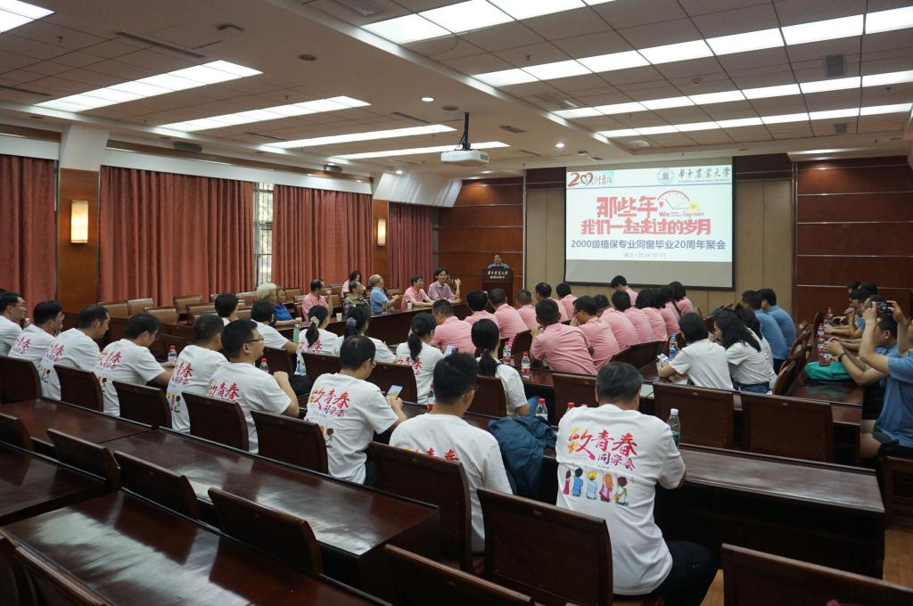 在植保2000级师生交流会中,学院副院长王满囷教授介绍学院和学科发展情况,他希望校友们常回来看看。会上,校友们畅谈过去二十年生活、工作等方面的成长。伍箴勇校友讲述他科研经历,他特别提到在今年九月份入学攻读张启发院士的博士,令各位校友深感振奋。陈飞校友则用一曲《浪漫樱花》把现场气氛推向高潮。侯明生、荣秀兰、黄俊斌、成国英、李国庆、王春、周兴苗等教师代表依次发言,表达对校友们的美好祝愿。