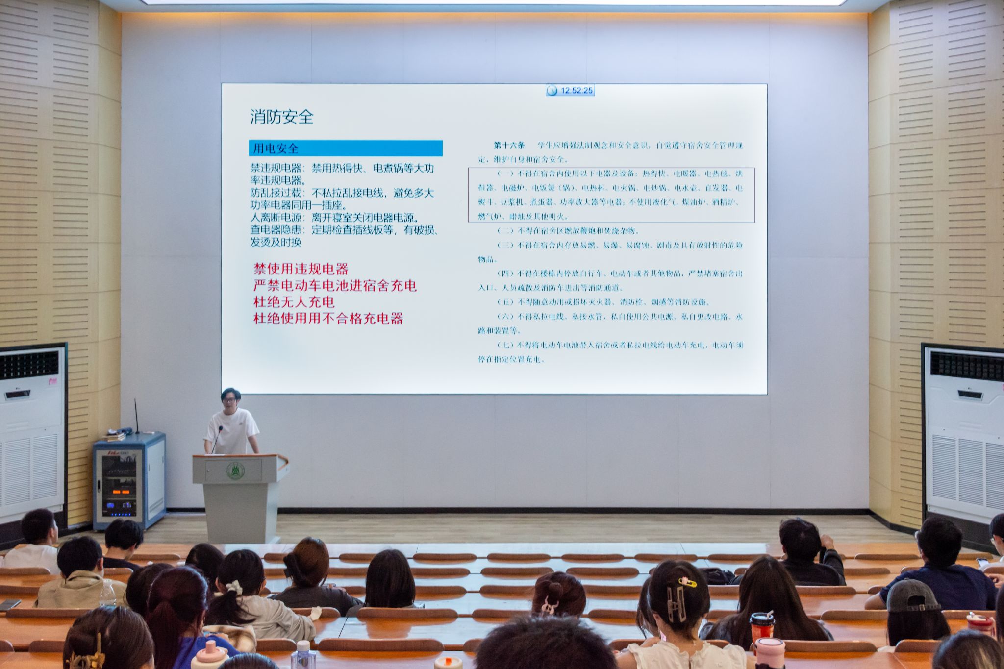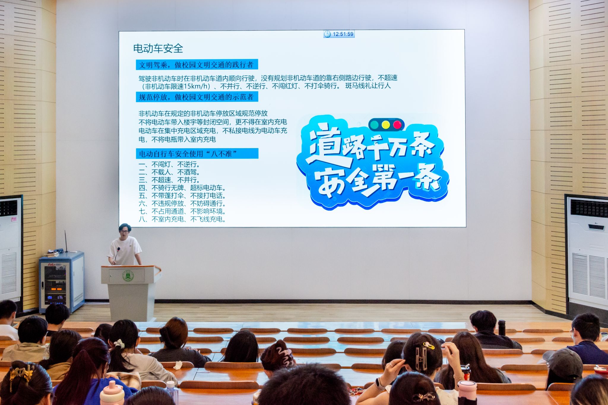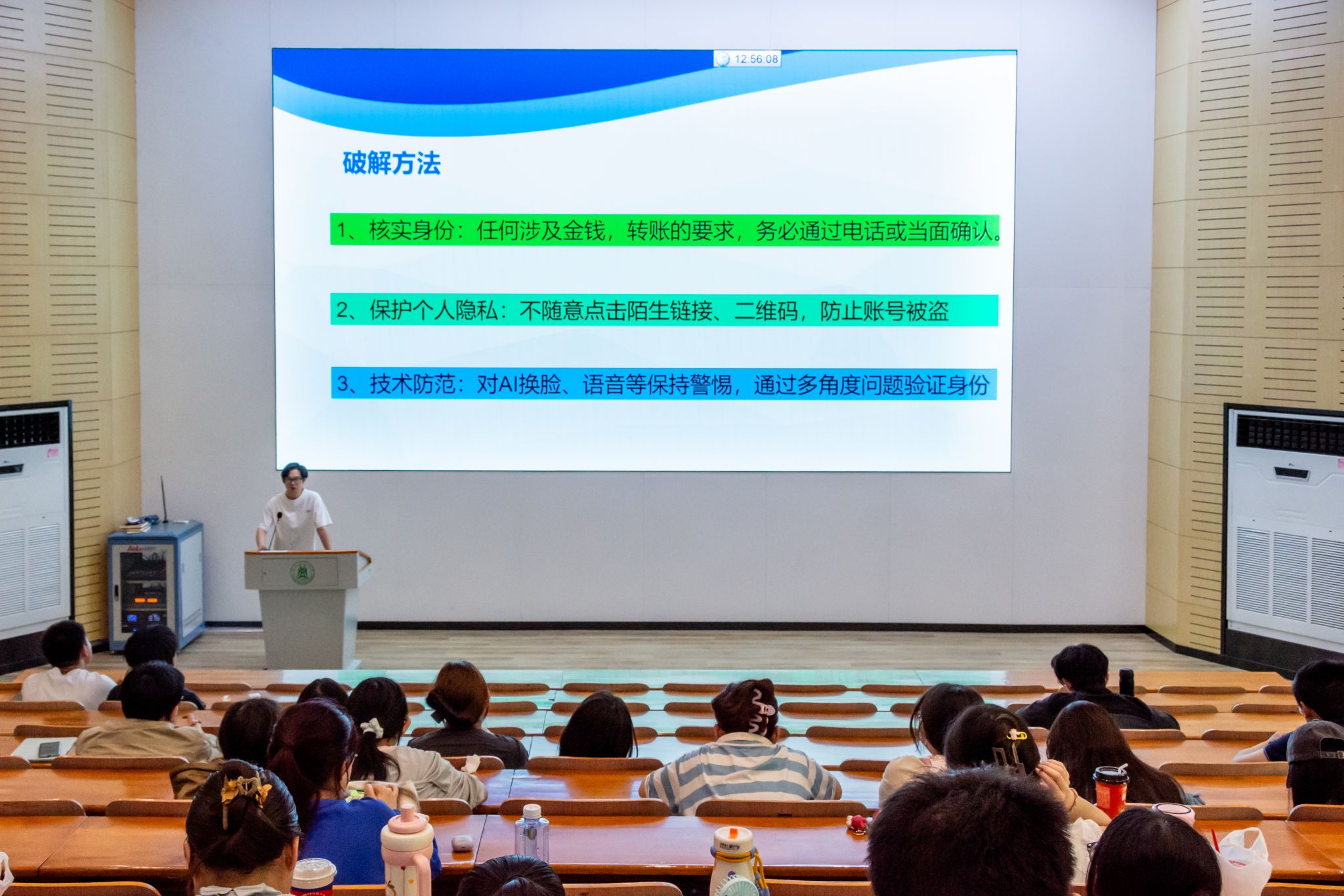 会议最后,刘子阳针对交通、消防、防诈骗进行安全教育提醒。在电动车使用方面,刘子阳重申"文明驾乘八不准"规定,特别指出严禁电动车电池室内充电、逆行、超速等危险行为。在消防安全方面,他提醒同学们要严格遵守宿舍用电规范,禁止使用热得快、电煮锅等大功率电器,不得私拉乱接电线,离开寝室要及时断电,并定期检查电器设备。针对当前高发的电信诈骗,刘子阳通过分析典型案例,向同学们传授了"不轻信、不转账、不泄露"的防范方法,并建议大家安装国家反诈中心APP,提高防范意识。