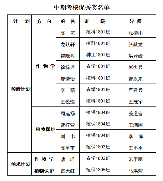 根据2018 级硕彦计划、硕果计划中期考核结果,评选陈宽等 11 名参与硕彦计划同学和唐瑶等 2 名参与硕果计划同学为中期考核优秀个人,现将名单公示如下: