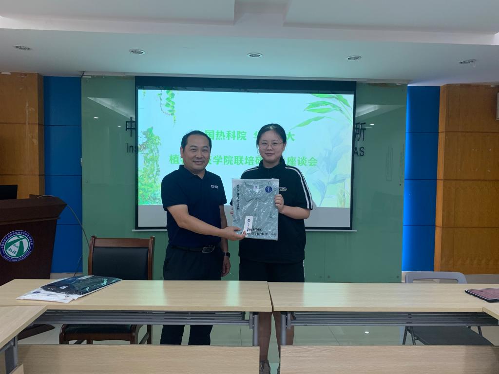 ——中国热带农业科学院联合培养研究生及导师代表进行座谈交流。中国热带农业科学院副院长谢江辉、研究生处处长郝朝运、研究员王祝年、黄天带、张家明等参加座谈。