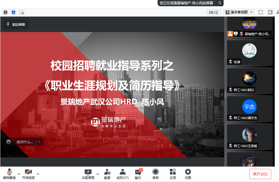 3月13日下午,学院“职面未来”系列培训第六期——“职业生涯规划及简历辅导”培训会于线上顺利举行。景瑞地产武汉公司人力资源总监、武汉大学土木建工学院职业发展导师陈小风为同学们上了一堂全面而生动的职业生涯规划课,并就简历制作进行有针对性的辅导,辅导员张涛主持会议。