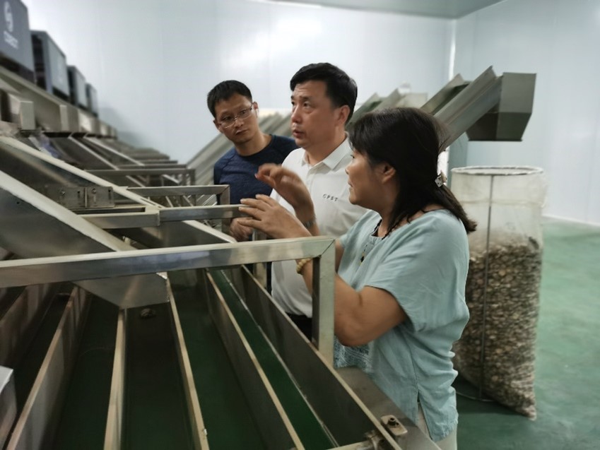 图5 课题组在现场调研了解香菇机器视觉分级分拣技术应用情况