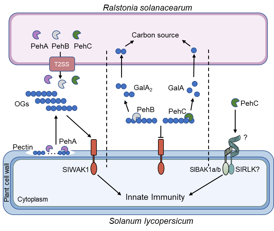 李博团队题为“Duality of immune recognition by tomato and virulence activity of the Ralstonia solanacearum exo-polygalacturonase PehC”的研究成果。该研究首次发现了青枯菌的PehC能够作为免疫激发子激活番茄根系的免疫反应,深入揭示了PehC作为多聚半乳糖醛酸外切酶能够水解寡半乳糖醛酸(OG)产生半乳糖醛酸(GalA),具有抑制番茄的DTI免疫反应和为青枯菌的定殖生长提供碳源的双重功能。