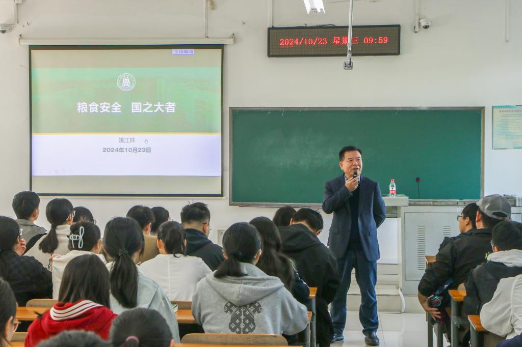 1023日上午,校党委副书记、副校长姚江林在三教A301教室,为我院植物生产类24012403班讲授“粮食安全”形势政策课。