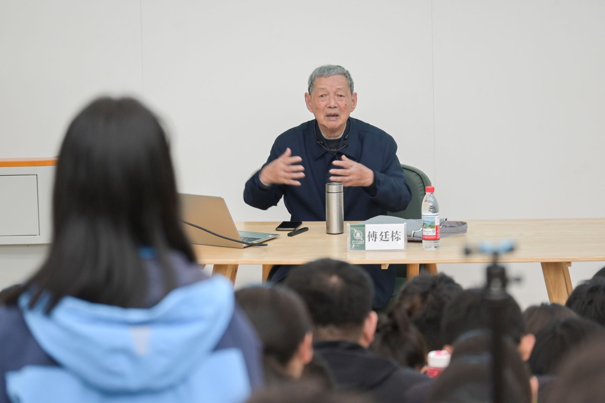 互动环节,同学们围绕科研坚守、技术创新、产业发展等话题踊跃提问。傅院士结合六十余年科研经历,耐心细致答疑解惑,分享了自己攻坚克难、砥砺前行的奋斗故事。他以“做人要知足,做事要知不足,做学问要不知足”与同学们共勉,鼓励大家永葆求知之心、奋进之志,在科研路上脚踏实地、行稳致远。