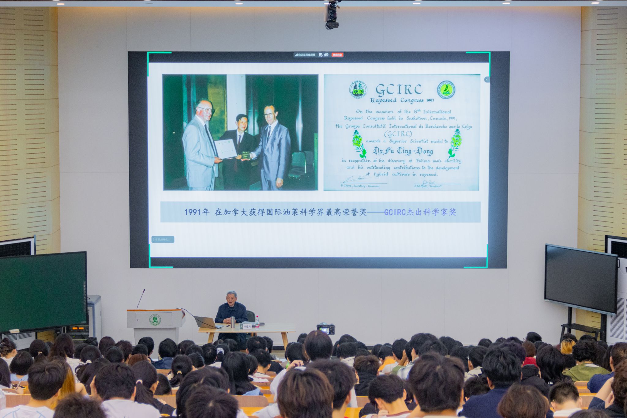 讲座中,傅院士回顾了自己在油菜育种领域的关键探索与突破。他率先发现具有重要实用价值的油菜波里马雄性不育系,为杂交油菜实用化与规模化发展奠定了坚实基础,凭借这一开创性成果,他荣获国际油菜科学界最高荣誉,成为该奖项设立以来首位获此殊荣的亚洲科学家。他带领团队攻克优质油菜育种难题,推动油菜品质全面提升,培育的优良品种在全国广泛应用,让更健康、更高产的油菜走进田间地头,惠及万千农户。面向生产难题,他带领团队持续攻关,培育出抗病、耐逆等一系列优良新品种,为破解生产瓶颈、拓展种植空间提供了有力支撑。
