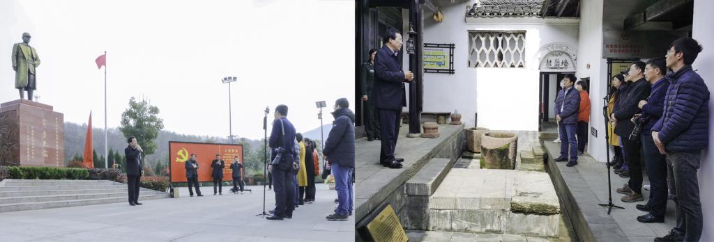 在随州市九口堰新四军第五师革命旧址纪念馆,周雄和边银丙代表师生向革命先辈李先念的雕像敬献花篮、共同缅怀了革命先烈,并重温了入党誓词。在讲解员的带领下,大家参观了新四军第五师纵队司令部、政治部合住的孙家大院,倾听了老一辈革命英雄的传奇故事,深切感受到同呼吸、共患难的军民鱼水之情。