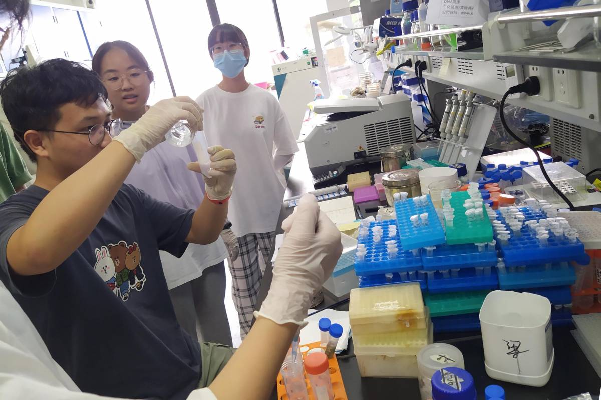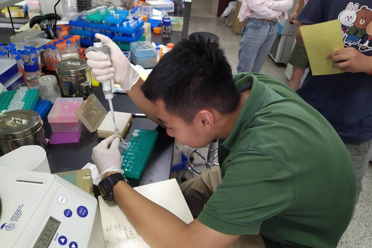 在硕士研究员沈浙南的指导下,实践团首先制备了一定浓度的孢子液。“基础的步骤就是刮取孢子、过滤、检测,因为提取的孢子会在短时间内陆续萌发,导致失去侵染水稻的能力,所以需要在一小时内完成孢子液的制备工作。”研究员指导道。看上去简单的步骤,但由于成员们毫无经验,操作起来状况百出,也因此两次制成的孢子液浓度都没有合格。由于材料有限,研究员帮助成员们将已提取的孢子液沉淀提纯,最终达到了实验要求。