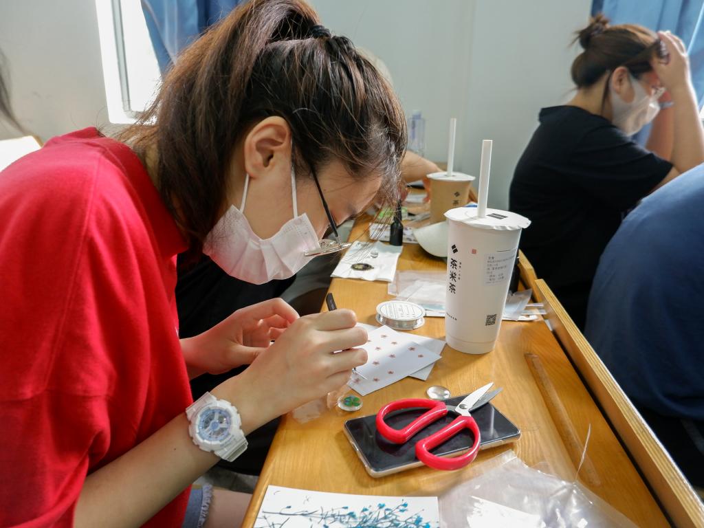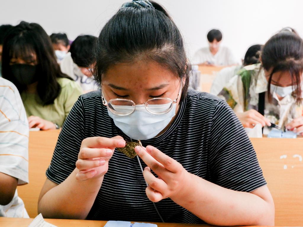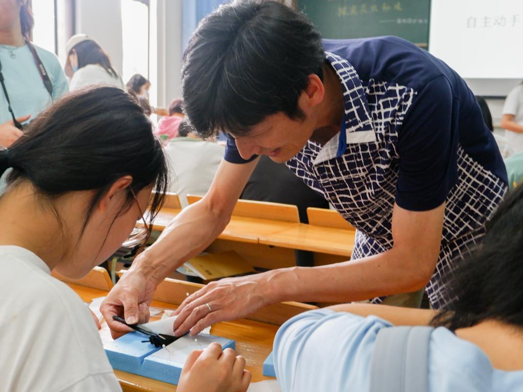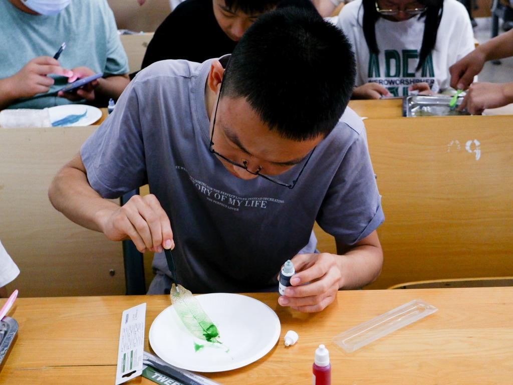 在相关材料发放到位后,就到了新生们最为期待的环节——自主动手操作体验。植物保护协会成员们向新生们详细讲解各种工艺品制作步骤,周兴苗教授亲自指导新生们动手制作昆虫标本、叶脉书签与滴胶吊坠等手工艺品,帮助新生解决在制作中遇到的各种问题,新生们积极动手,亲手制作出一份份只属于自己的小工艺品,活动现场气氛欢快融洽。