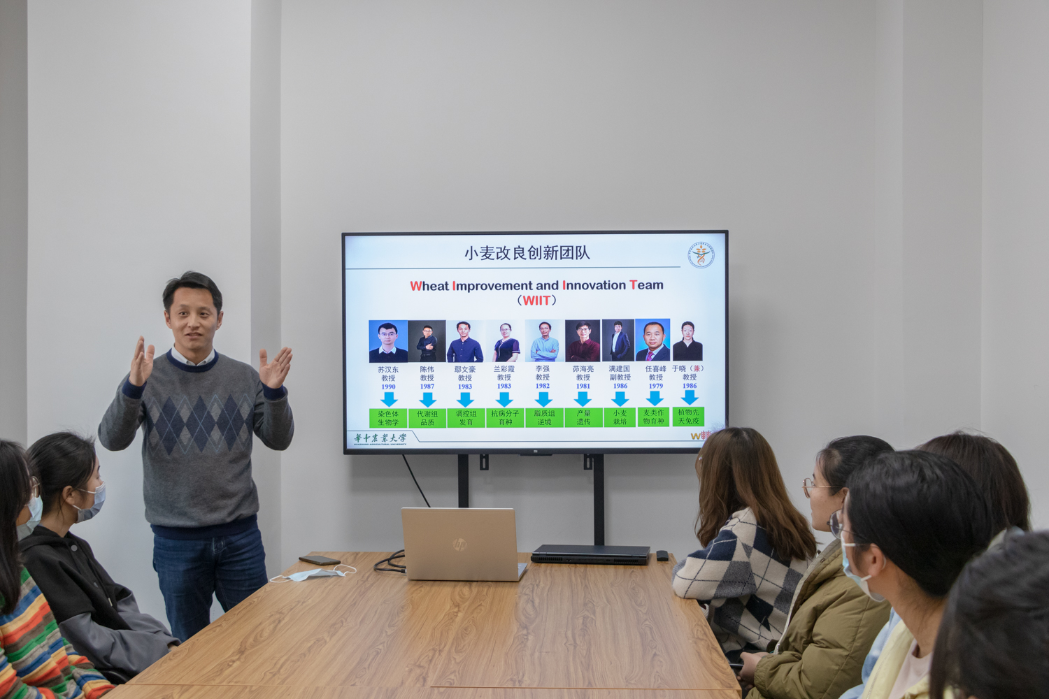 小麦研究的历史,并详细介绍了现今小麦团队的组成,展望了科研之路的未来。在介绍这支新起之军时,他激情澎湃、斗志昂扬地讲道:“作为一个年轻的,思想活跃的团队,我们有信心会在未来给同行一个惊喜。”紧接着,鄢文豪向同学们依次介绍了小麦团队的成员及其对应的研究方向,从曾经是最年轻的陈伟教授到90后教授苏汉东,“年轻”“实力派”“思维高度活跃”“团结”无疑是这支队伍最鲜明的代名词。此外,他还为同学们详细地介绍了小麦产业链和小麦团队的研究平台,引得同学们一片心驰神往。谈及科学研究,他指出,未来的科研应该是以个人兴趣与国家需求为双重导向的,相辅相成之下才会成就更好的未来。