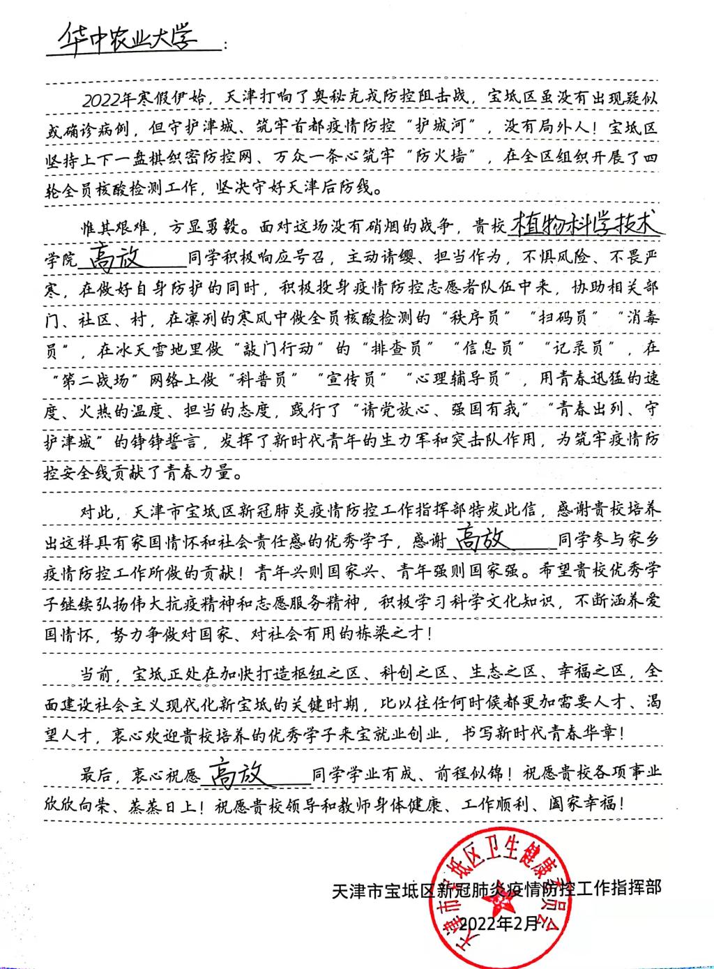 大学发来感谢信,信中鼓励她继续弘扬伟大的抗疫精神和志愿服务精神,努力争做对国家、对社会有用的栋梁之才。贵州省安顺市1月27日新增一例新冠阳性病例后,政府封锁了各条出入安顺的交通通道。“收到这个消息时,我脑海里马上浮现出了一个念头——我要去做志愿者。能为家乡疫情防控做些力所能及的事,是作为一名青年学生的责任。”植生2109班罗颖动情地说。罗颖当天晚上便联系居委会的工作人员,报名了疫情防控志愿者,协助28日的全市核酸检测工作。工作中,罗颖负责核酸检测小程序的科普、居民个人信息的登记和网上录入工作。参与到自己家乡防疫工作中的,还有植生2104班黄梦璇、21级农科张之洞班马翼恬、张伟。他们坚信,尽管自己的力量微薄,但是多方联动,共克时艰,必能打赢这场持久战。