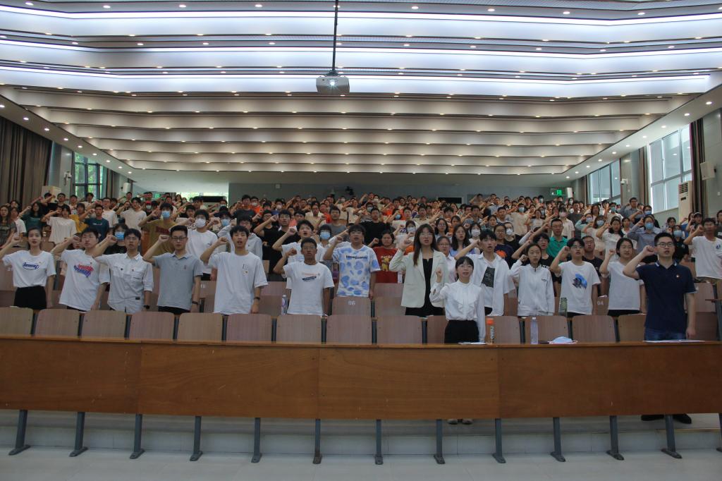 2022年上半年新发展党员入党宣誓大会在第三教学楼S1教室举行。学院44名新发展党员以及全体本科生党员参加会议,学院党委组织员马平福,辅导员张涛出席会议。