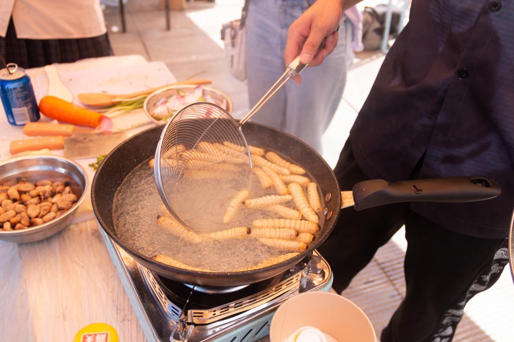 经过一段时间,烧烤蚂蚱、爆炒竹象幼虫、油炸天牛幼虫、蝉蛹寿司、蜂蛹茄盒等昆虫美食在参赛队员精湛的厨艺下逐渐成形。其中第五组制作的柠檬面包虫因其特有的口感收获了许多观众的点赞,小组成员农学2003班苏芙蓉笑着说道:“这次昆虫宴对于我们来说是一次全新的尝新。大家都克服了对昆虫恐惧,发挥想象、面不改色地把它变成美味佳肴,像是上了一堂生动的昆虫实践课。”