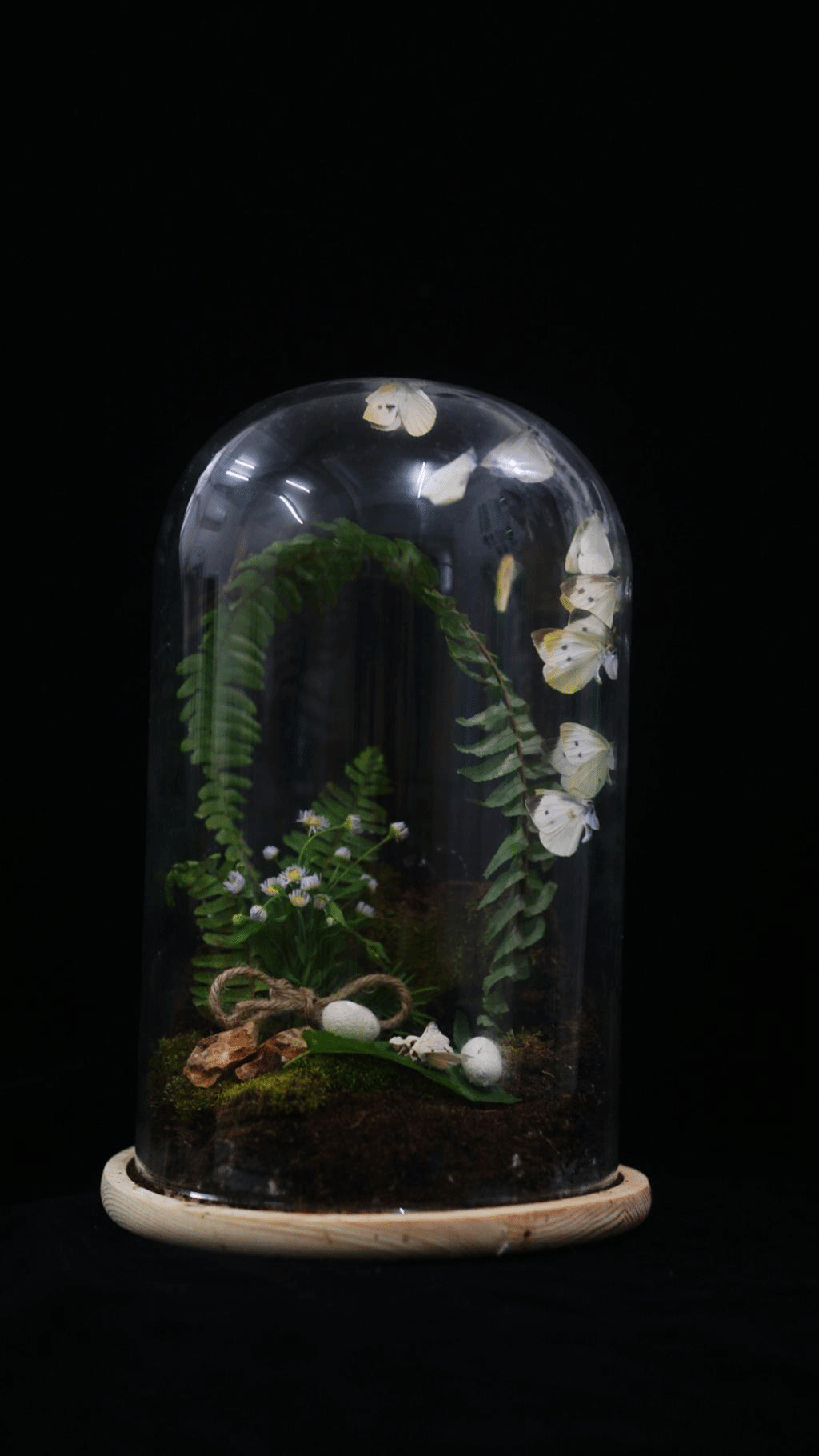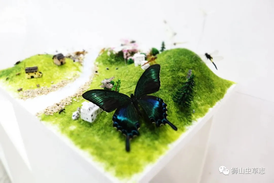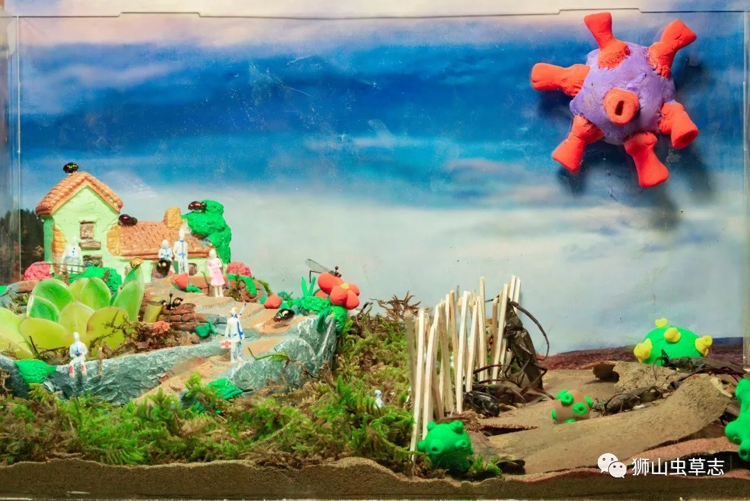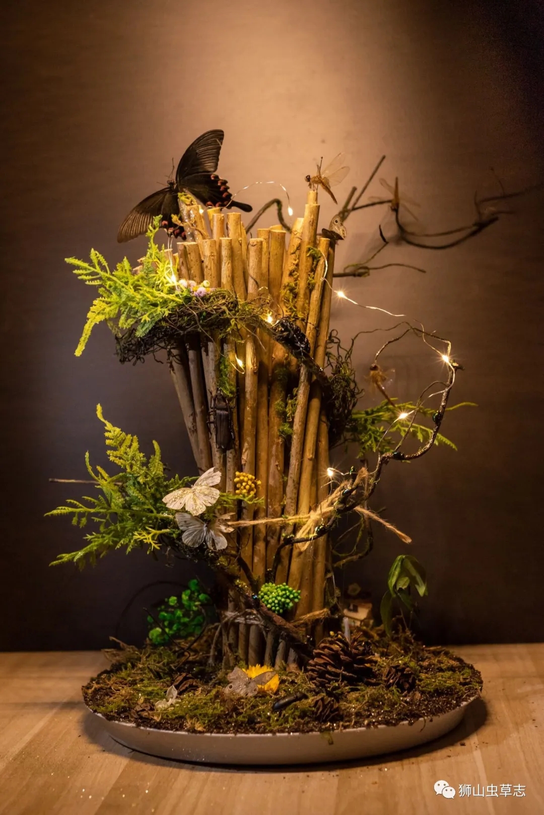“大鹏一日同风起,扶摇直上九万里”,一等奖作品《扶摇》表现了当代青年人朝气蓬勃,奋发向上的时代精神。该作品主体为蜿蜒缠绕的藤蔓,前路漫漫、崎岖坎坷,却仍旧蜿蜒攀升、无畏巉岩,周身点缀的灯光唯美地点明了“道路是曲折地,前途是光明的”的时代命题。蜻蜓、凤蝶、眼蝶、天牛、蝼蛄等昆虫巧妙地生活在乱枝围绕中,表现了它们挺过幼虫期的强敌环伺、捱过蛹期的艰难困苦、终得一身绚烂的生命意义。《陋室筑新府,花香引蝶来》则指出了实施乡村振兴战略,是实现美丽中国梦的必然要求。左边的颓垣败瓦、破旧房屋、杂草丛生,以及在老房子中栖息的蟋蟀、蚂蚁、蝗虫等昆虫,表明了面对这样百废待兴的景象,尽管实现美丽乡村的过程中有困难、有险阻,但由破旧房屋出发的菜粉蝶向着河对岸的美丽乡村形成了“蝶桥”,代表了我们相信乡村能够走向美好,走向振兴的决心。