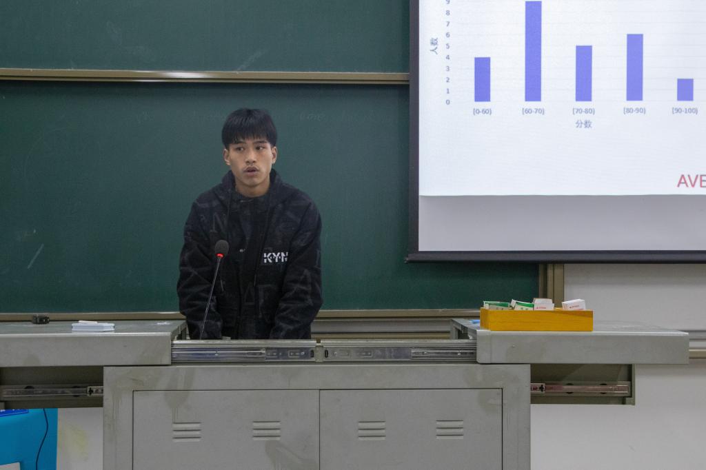 班会伊始,班长罗铮以臧克家一诗引出此次班会主题,学习委员冯唯源分析了班级的学习成绩并邀请成绩优秀的同学分享学习经验。