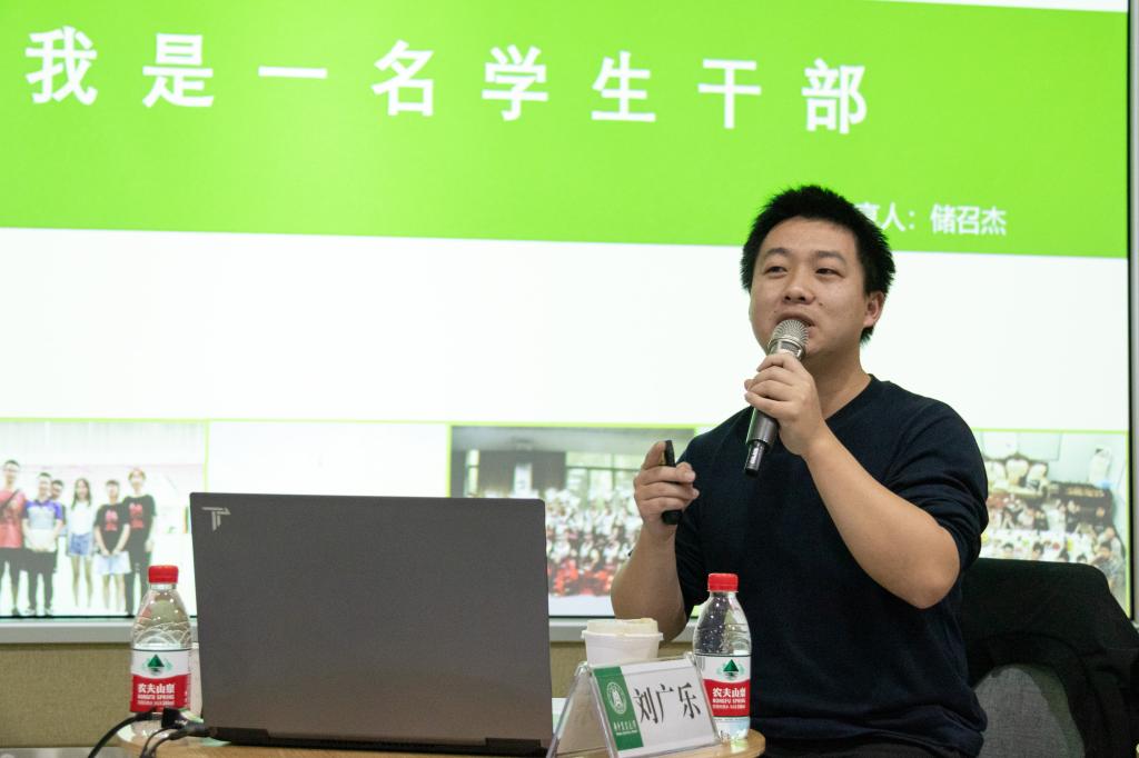 储召杰以"我是一名学生干部"为主题展开分享。他表示,学生干部是学习者和服务者。他将学生干部角色比作桥梁、镜子、窗户、旗帜,明确了学生干部的职责定位及应当具备的综合素养。他提出,学生干部开展工作要深入学生群体,立足专业特色去组织策划活动。他以自身为例,分享了作为学生干部如何平衡学生工作中的得与失。