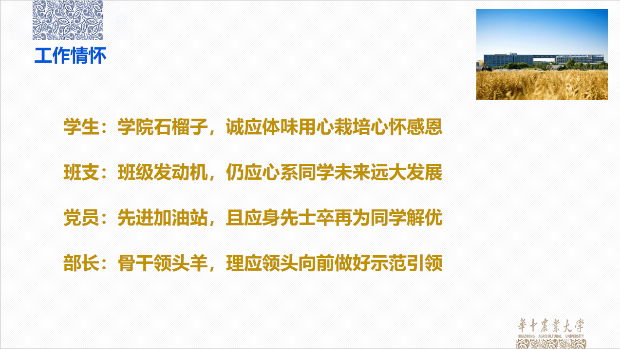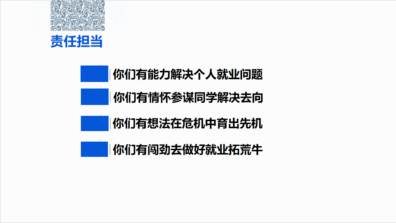 熊攀攀号召大家积极参与学院就业工作。他表示,学生是学院石榴子,诚应体味用心培心怀感恩;班支是班级发动机,仍应心系同学未来远大发展;党员是先进加油站,且应身先士卒再为同学解忧;部长是骨干领头羊,理应领头向前做好示范引领。大家都应关注身边同学,积极带动他们行动起来,一起推动就业工作进行。他说道:“我们要一起谋定同学一生远大事业做带动者、一起稳固学院荣誉归属感争做促进者、一起贡献学科评估专业建设做支持者、一起夯实学校生源质量基础做打桩者、一起踏实奋进主动参与就业做行动者。“
