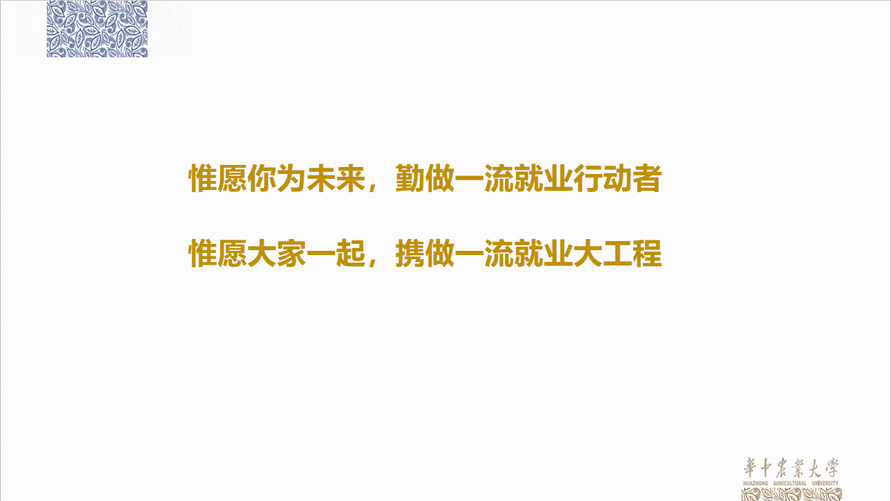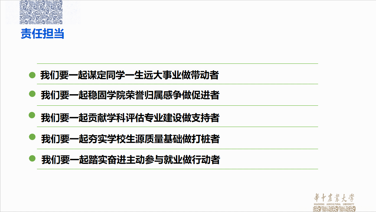 会议最后,熊攀攀再次倡议大家要携手共同努力,积极推动学院2017级就业工作。“惟愿你为未来,勤做一流就业行动者;惟愿大家一起,携做一流就业大工程。”