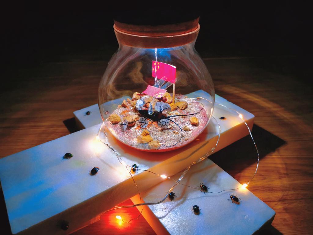 荣获一等奖的植物保护宇宙重点实验室队伍的作品《我们的征途是星辰大海》格外引人注目。他们的作品玻璃球基部的红色模型泥、散沙和土粒展现了那颗红色星球上的浩瀚平原。广袤的红壤上插有一面五星红旗,标志着中国的装备已经成功登陆。桃红颈天牛的跗节上装有车轮,象征着“祝融号”火星探测车。上面悬空的红蜻蜓则代表着“天问一号”火星探测器。五星红旗是它的家乡,也是它的使命。天牛与蜻蜓之间若即若离,反映了“祝融号”刚刚离开探测器母体,实现软着陆的场景。