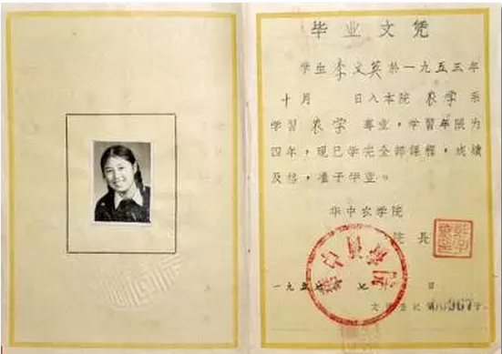 那是一本几乎被翻烂了的毕业文凭,内页里满满当当地排满了各科成绩,还盖着华中农学院老院长许子威、农学系老系主任刘后利的印章。扉页黏贴的照片里,一个眉清目秀的姑娘,梳着两把麻花辫子,笑得灿烂。