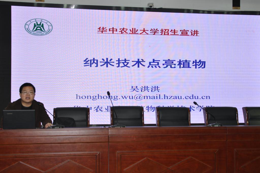 “纳米材料是什么?”“纳米技术能为我们做什么?”讲座伊始,吴洪洪向同学们抛出了这些问题,激起了在场同学们的思考。他通过“炸弹”监测植物与纳米发光植物的视频与原理图,向同学们展示纳米科学在植物中的科学研究应用。同时,吴洪洪介绍了基于纳米感应元件构建纳米智能作物,可以实时监测植物体内过氧化氢、葡萄糖等物质的含量,实现作物早期受胁迫时及时预警,减少实际生产中的产量损失。吴洪洪引导同学们对未来智慧农场的思考,鼓励同学们探索自己的兴趣方向所在。随后,吴洪洪介绍了校情院史等情况,他结合个人学习及工作经历鼓励同学们要扎实学好知识,为以后的成长打下坚实的基础。