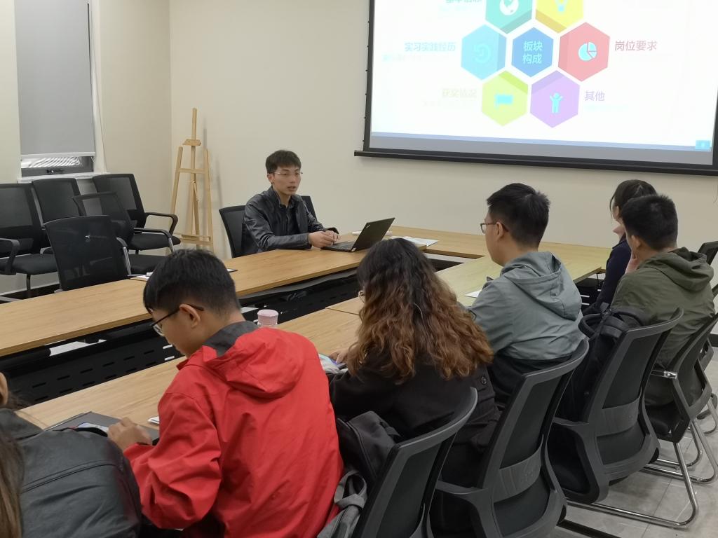 就业指导中心刘超老师作为主讲嘉宾,分享了简历制作及面试的方法技巧。辅导员张涛主持会议。