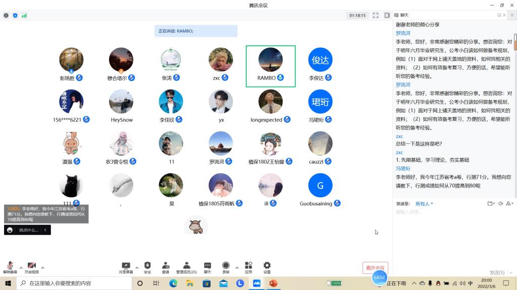 2018届硕士毕业生李树波,重点围绕公务员选调生备考技巧与心得作交流分享。我院本研毕业生线上参与,兼职辅导员彭扬胜主持会议。