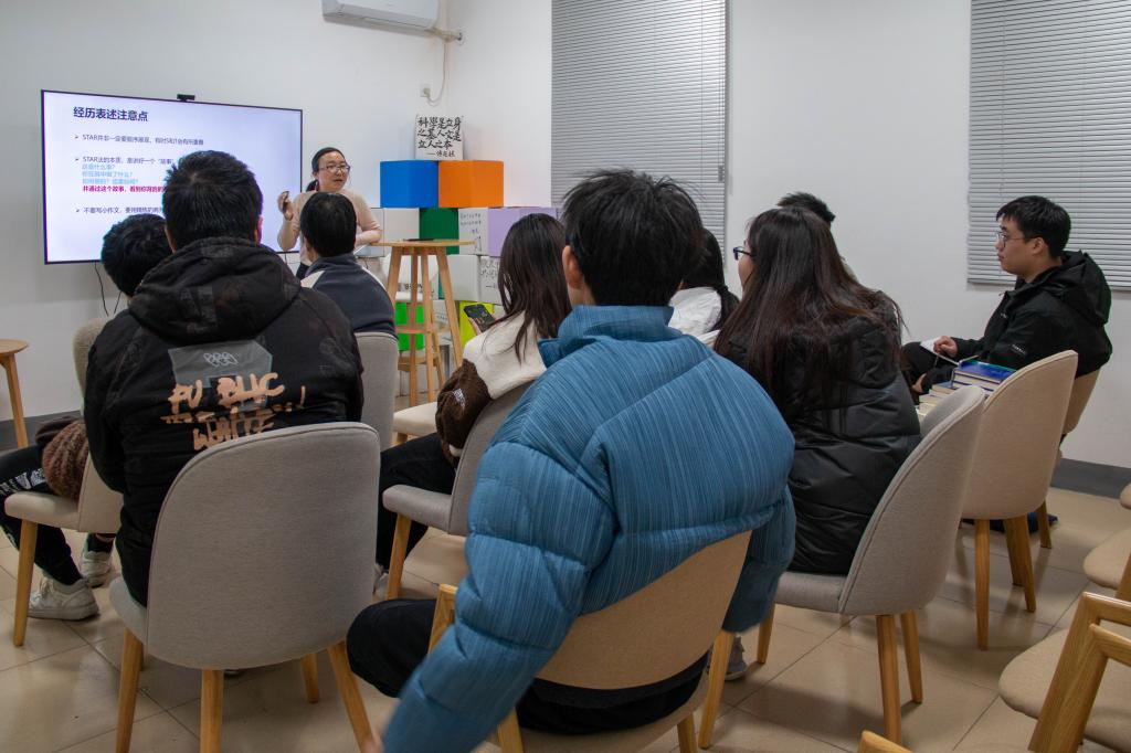 “策划组织简历比拼大赛”可刷新表述为“带领4人团队,策划首届校级求职简历比拼大赛,吸引到3家赞助企业和200份参赛简历”段林娜向同学们分享并使用了star(situation,task,action,result)刷新法则。随后,她着重围绕简历中的实习或校园经历撰写标准展开介绍。她说道:“大家在进行此部分撰写时应立足主要项目内容显示自己的能力点和能力程度,避免堆砌过多内容。”