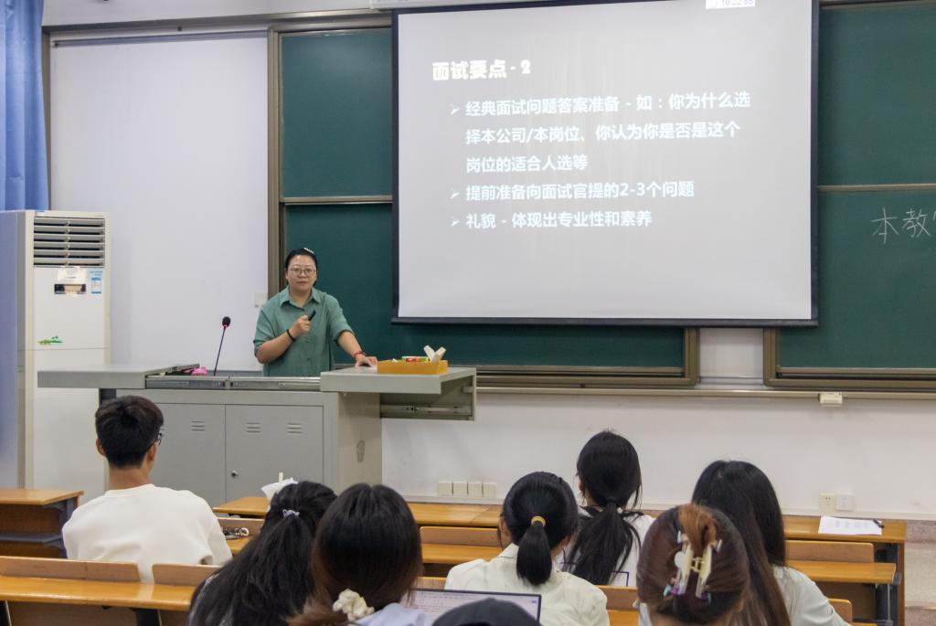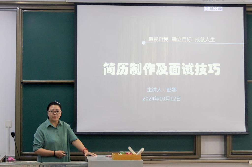 在简历制作环节结束后,彭娜老师又转向了面试技巧的介绍。她强调了形象、时间管理和自我介绍在面试中的重要性,并提醒同学们要注意细节,如带笔记本和笔去面试,以表现出自己高度重视本次面试的态度。