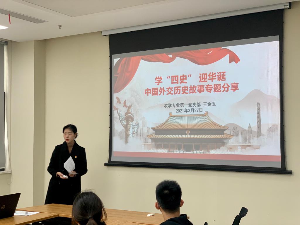 植保专业第一党支部的余闯同志分享了1949年到1978年新中国“和平共处外交”,向同志们介绍了党的十八大以来,以习近平为核心的党中央加强党对外事工作的集中统一领导,走出了一条中国特色大国外交新路。