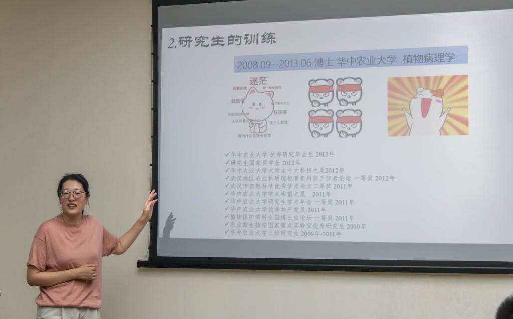 于晓也谈到自己在博士后期间研究的是植物先天免疫。“研究植物抗病的基础是免疫,植物先天免疫是提高植物抗病性最有效、最经济的方法。”她表示,即使自己在就读研究生和博士期间的成绩还算优异,但在植物先天免疫这一块对于她来说却是全新的领域,研究上遭遇的挫折和困难数不胜数,她也频频受到打击。紧接着她向同学们分享了她战胜这些挫折的经验。她表示,首先要明确自己的研究内容以及遇到的问题,接着熟读相关文献,并保证实验研究的相关工作量,再者是要稳扎稳打,每一步都要脚踏实地,坚持不懈,合作共赢,最后是要紧跟领域动态。