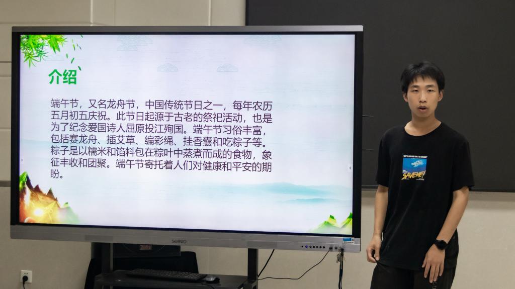 “端午节,又称端阳节、龙舟节等,是中国四大传统节日之一,每年农历五月初五庆祝。此节日起源于古老的祭祀活动,是为了纪念爱国诗人屈原投江殉国。端午节习俗丰富,包括赛龙舟、插艾草、编彩绳和挂香囊等,是集拜神祭祖、祈福辟邪、欢庆娱乐和饮食为一体的民俗大节。”活动伊始,主持人首先向大家简单介绍了端午节的起源和传统习俗。