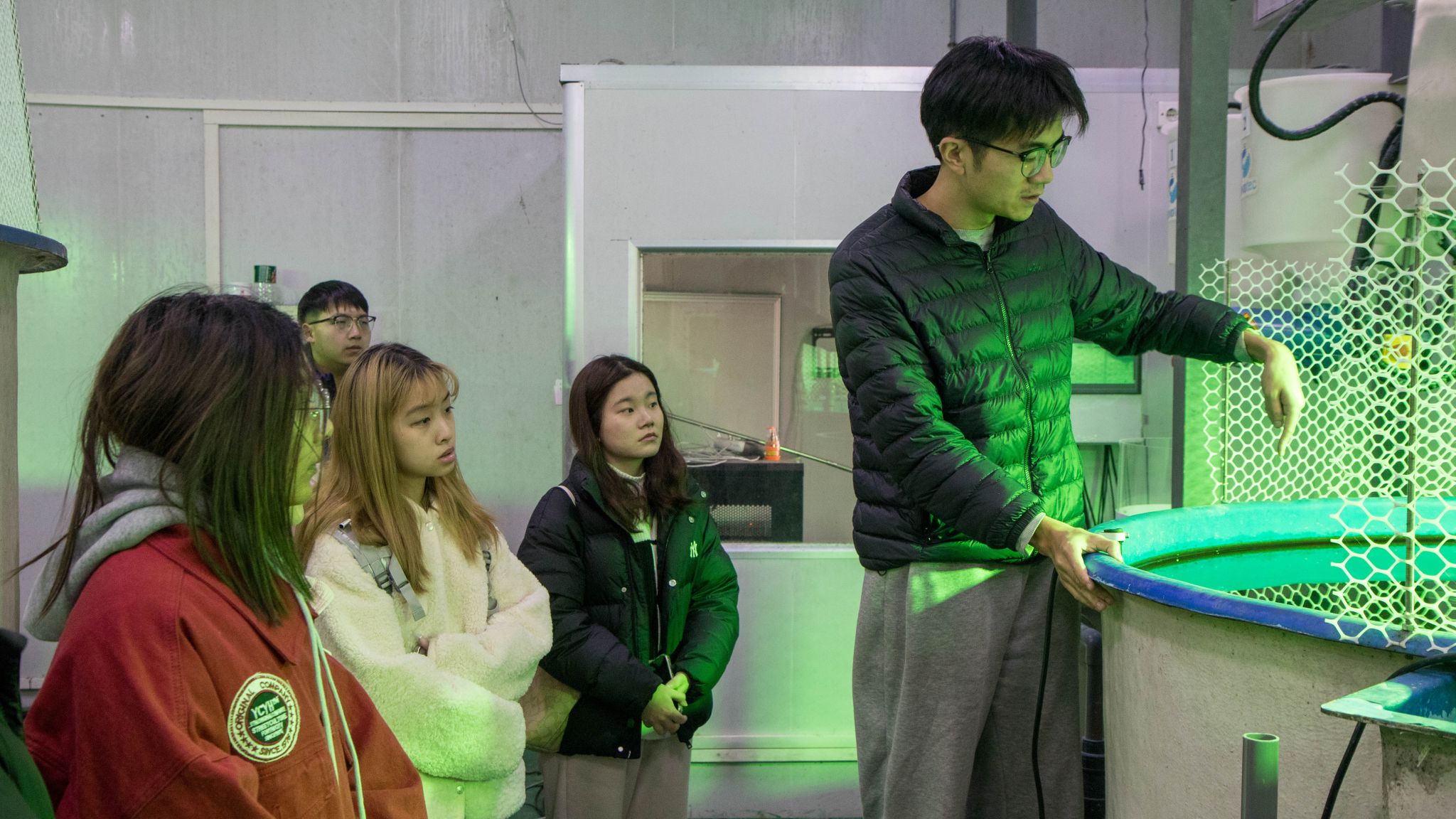在水产养殖基地,高坚带领同学们近距离观摩工厂化循环水养殖系统,围绕循环水养殖系统的液氧系统、生化处理系统、尾水处理固液分离器等内容为同学们上了一堂生动的智慧渔业微课,并解释了各系统如何协同工作以实现尾水的有效处理与循环利用。面对同学们提出的“养殖基地为什么要使用绿灯?”的问题,高坚解释道:“绿色光谱可以抑制鱼性腺的发育,从而控制养殖密度、提高养殖效益。”