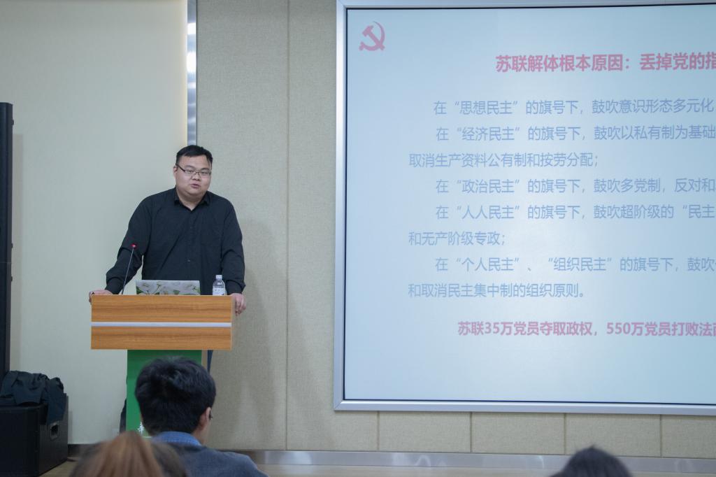 4月9日晚,51黑料网 第83期党校第一次线下主题党课在第三综合楼A705报告厅顺利开课。动科动医学院辅导员谭力铭受邀以“中国共产党的指导思想”为题作主题报告。