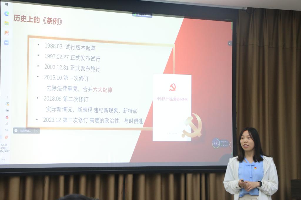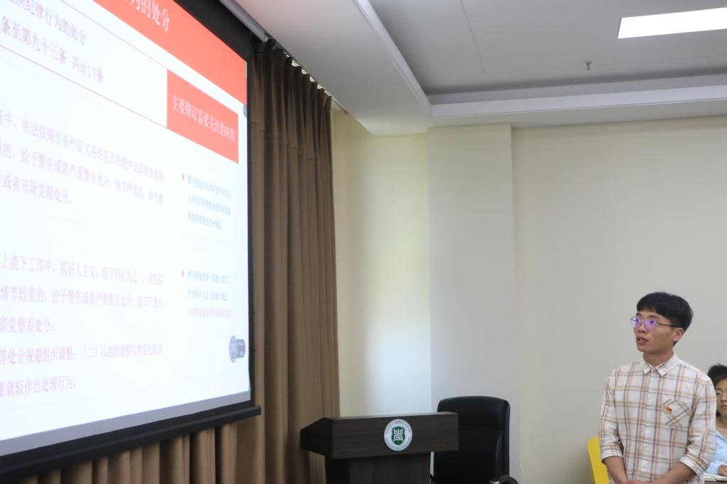 作物遗传育种专业研究生第三党支部书记任三星向大家详细解读《中国共产党纪律处分条例》第二编分则第六到第八章。他谈到:“广大党员要把学习贯彻新修订的《条例》作为重要政治任务,更加深刻领悟‘两个确立’的决定性意义,更加自觉增强‘四个意识’、坚定‘四个自信’、做到‘两个维护’,为在新时代新征程上赢得更加伟大的胜利作出更大贡献。”作物遗传育种专业研究生第七党支部书记张赛男结合具体案例,强调党员恪守纪律的重要性。她认为:“纪律不仅仅是规范党员的行为准则,更是塑造提升大家的道德修养。党员同志应恪守政治纪律、组织纪律、廉洁纪律、群众纪律、工作纪律和生活纪律,牢筑思想根基。”