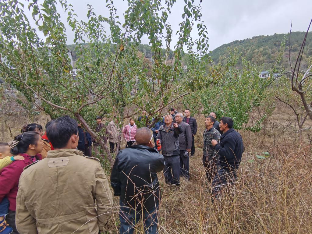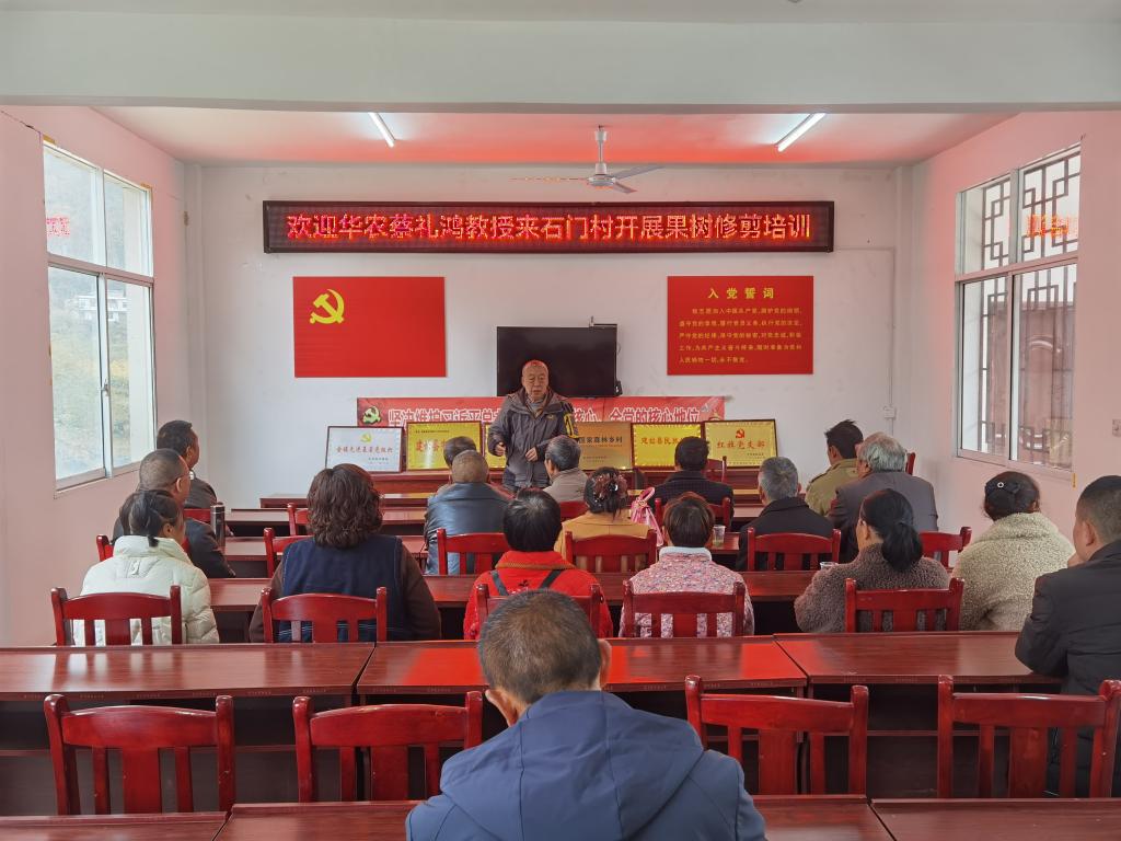 石门村党支部书记姚红介绍了石门村基本情况以及水果产业发展现状,驻村第一书记王飞介绍了驻村帮扶工作。针对石门村果树修剪缺乏技术指导的情况,蔡礼鸿教授为石门村20余名果农开展冬季果树田间管理专题培训会。培训会后,蔡礼鸿教授前往果园为果农开展李子树、桃树修剪和田间管护的示范教学。