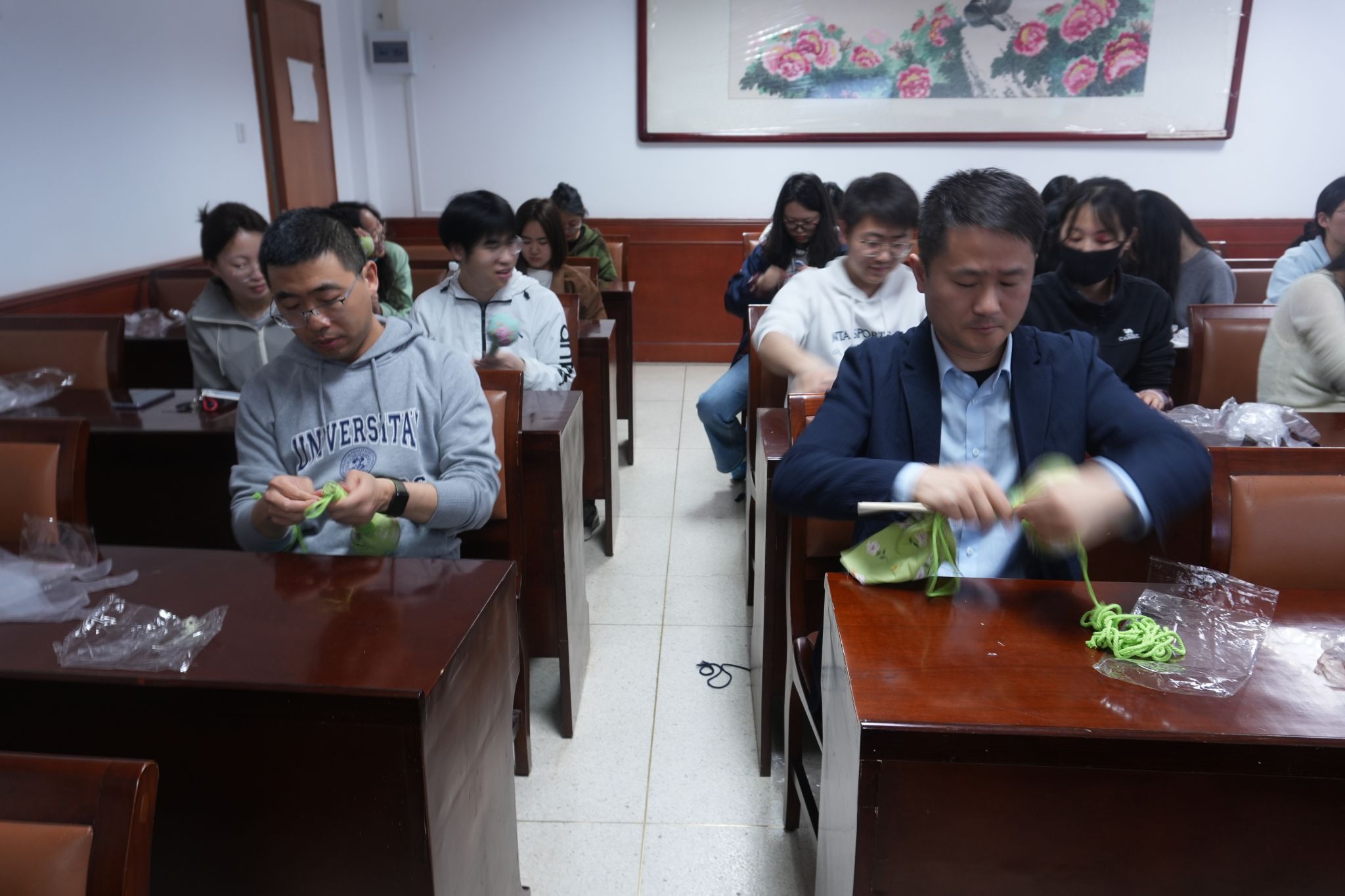 随后,大家领取制作艾草锤的手工材料,其中包括粗布、决明子、艾草包、锤柄、麻绳、橡皮筋等。在整个制作过程中,师生之间配合默契十足。经验丰富的老师耐心地为同学们解答疑惑,分享自己的小技巧;大家一边动手制作,一边分享着科研、学习生活中的趣事。在轻松愉快的氛围里,一个个精美的艾草锤在大家手中诞生。
